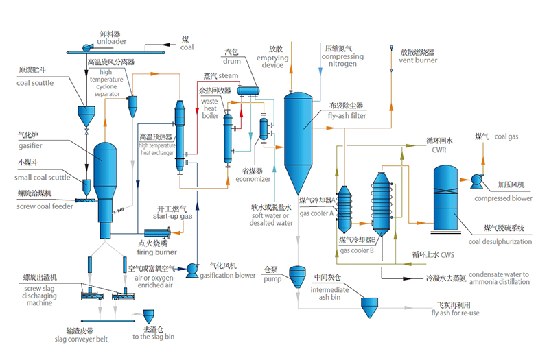 原煤经过破碎后通过皮带输送至原煤贮斗,由螺旋给煤机送入气化炉,与来自高温预热器的高温空气(或富氧气化剂)、蒸汽发生气化反应,所产生的炉渣通过皮带输送至渣仓;气化所产生的粗煤气夹带飞灰进入高温旋风分离器,大颗粒飞灰被分离后返回炉膛继续反应,小颗粒飞灰与煤气在高温预热器内与来自气化风机的空气(或富氧气化剂)、汽包的蒸汽进行热交换,产生高温气化剂;出高温预热器的煤气再进入余热回收器、省煤器与水进行热交换,产生饱和蒸汽;出省煤器的煤气进入布袋除尘器,在此小颗粒飞灰被过滤并送入气力输送系统,所产生的洁净煤气进入煤气冷却器,降温后进入煤气脱硫系统脱除硫化氢,经煤气加压系统加压后送入用户(煤气脱硫及煤气加压系统可根据后续工艺选择性建设)。